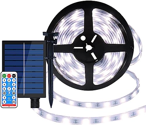 echosari Bande lumineuse solaire LED d'extérieur de 5 m avec télécommande et 8 modes d'éclairage solaire étanche pour clôture, porche, tonnelle, cour, arbres, décoration intérieure (blanc froid)