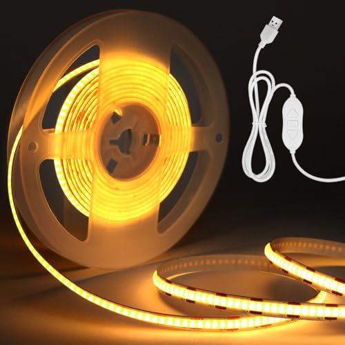 AebeChun Bande LED COB de 2 m, 5V USB Dimmable 3000K 640 LEDS Blanc Chaud, Bande Lumineuse LED pour TV Rétroéclairage, Bande LED Flexible pour Rétroéclairage TV, Chambre à Coucher, Éclairage DIY