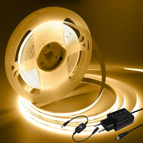 iNextStation Ruban LED COB 12V 5M Blanc Chaud 6000K, Dimmable Haute Densité CRI93+ Bande Lumineuse LED avec Adaptateur, Flexible Découpable Bande LED pour TV Rétroéclairage, Armoire, Chambre, Cuisine