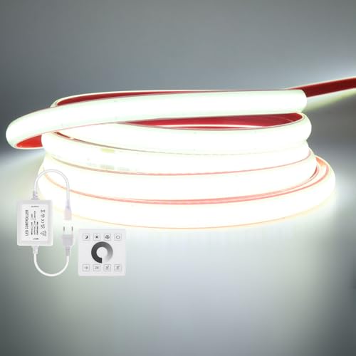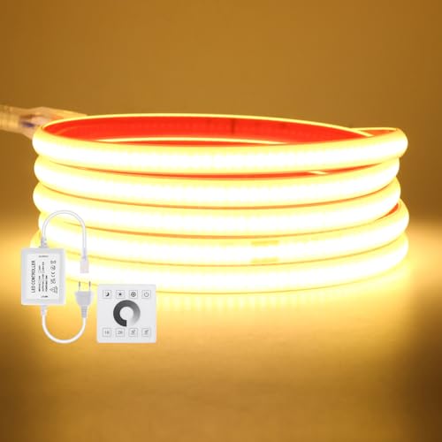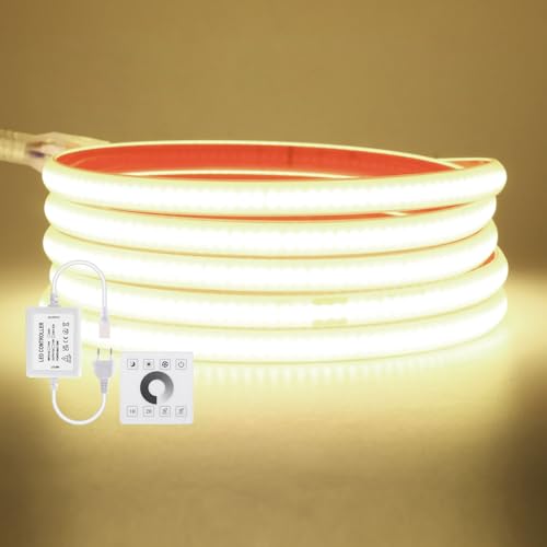 KISUFU 220V Ruban LED COB, Bandeau LED Dimmable, Flexible 288 LEDs/m IP65 Etanche Colle double face Lumineuse Bandeau Light Strip avec Variateur tactile RF 750w pour Chantier, Chambre.
