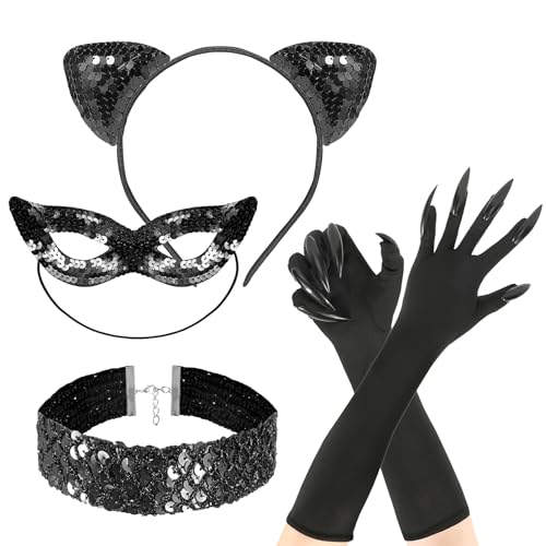 Hifot 4 pièces Déguisement Chat Femme,Oreille de Chat Serre Tete Collier Gants Griffes de Chat Masque Chat Bandeau Cheveux de Déguisement pour Fête Carnaval Halloween Cosplay