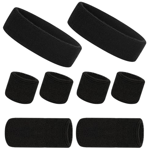 Bandeau de Sport et Serre-Poignets Ensemble, Coton 2 x Bandeau et 6 x Poignet, 8 Pièces Anti Transpiration Homme Femme Enfant pour Gym Running Tennis Basketball Yoga