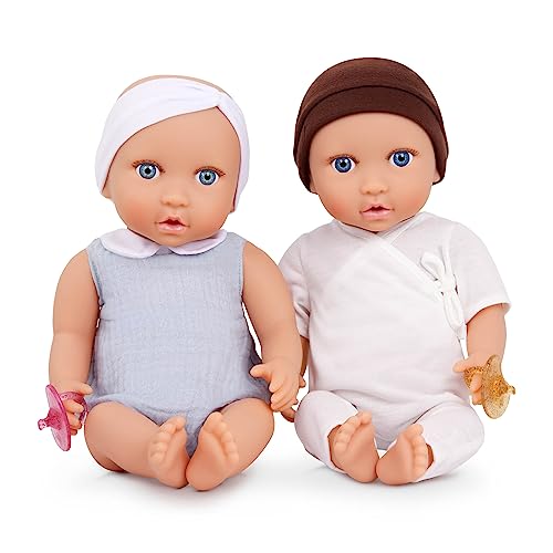 LullaBaby - Poupées Jumelles réalistes de 36 cm - Peau Claire et Yeux Bleus - Corps Souples et Tenues Amovibles - Accessoires pour Chapeaux, Bandeaux et sucettes - 2 Ans et +