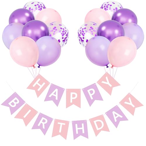 Decoration Anniversaire, Banderole Happy Birthday, Ballons Anniversaire Violet Rose, 16 Pièces 12 Pouces Ballons Rose Métallique Violet et Banderole Joyeux pour Décoration D'anniversaire Fille Femme