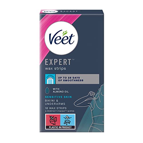 Veet Expert Lot de 30 bandes de cire d'épilation pour aisselles et ligne de bikini pour femme Convient aux peaux sensibles avec lingettes de finition à l'huile d'argan naturelle