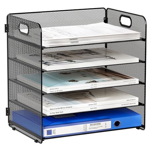 EasyPAG 5 Compartiments Métal Maille A4 Vertical Porte-Revues,Banette de Rangement Bureau,Corbeilles à Courrier,Organisateur de Magazine,Range Document,Bannette Papier avec Tiroir,Noir