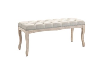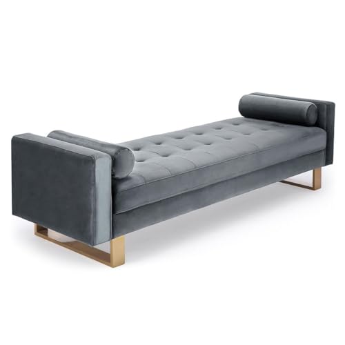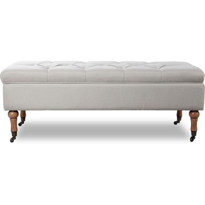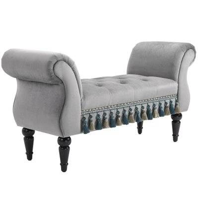 Banc banquette capitonnée design accoudoirs courbés pompons pieds bois hévéa revêtement velours gris