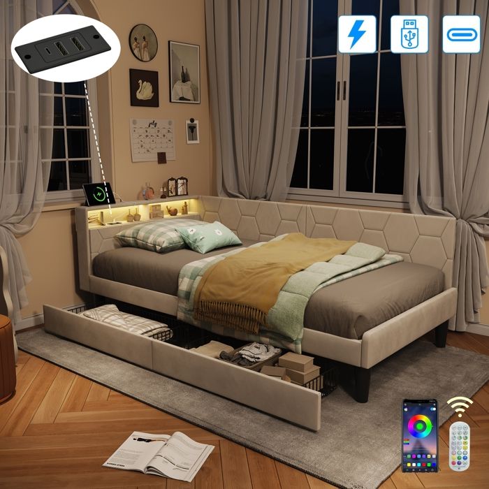 Lit banquette 90x200 cm en tissu beige, tête de lit capitonnée, 2 tiroirs de rangement, sans matelas