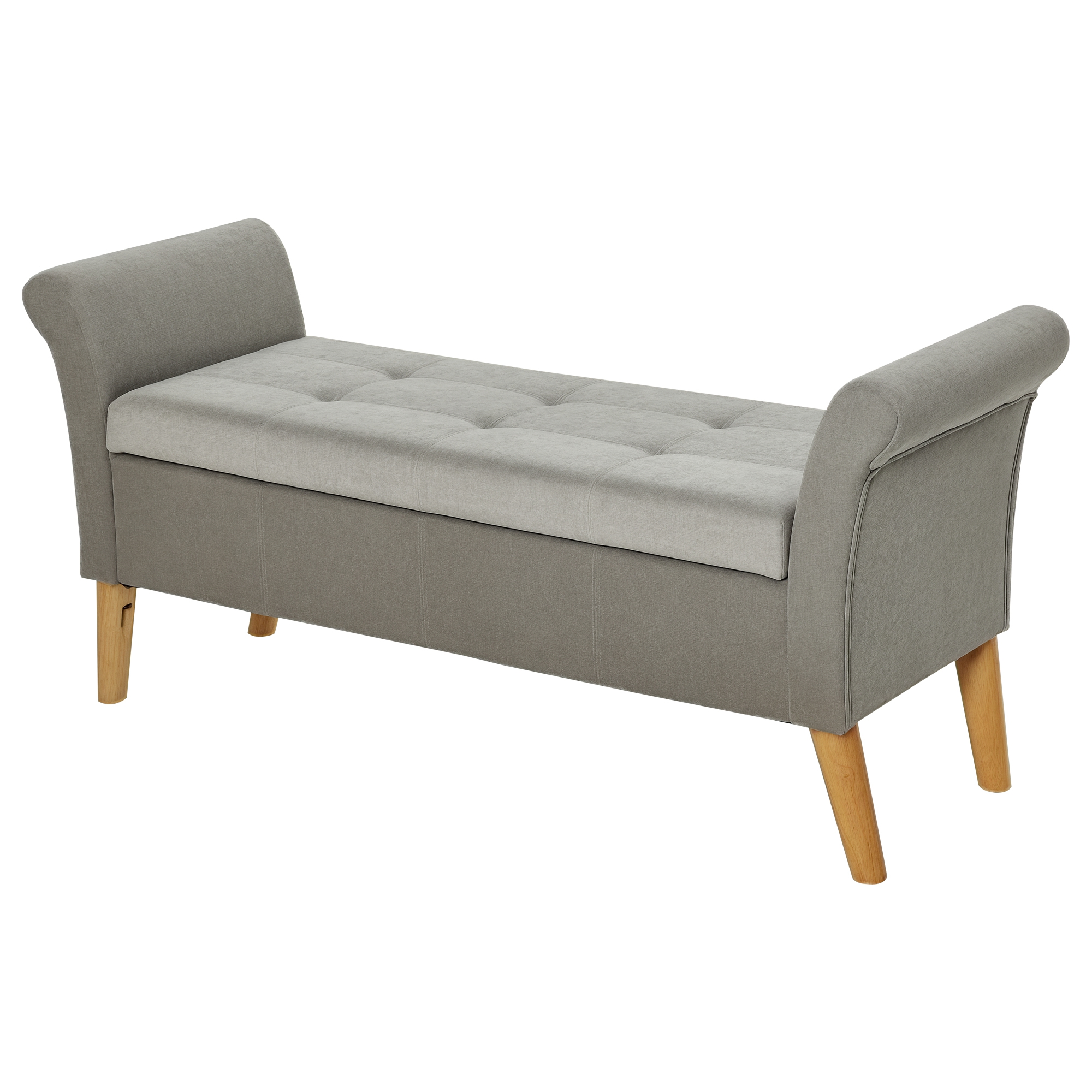Banc banquette capitonnée design accoudoirs courbés pompons pieds bois hévéa revêtement velours gris