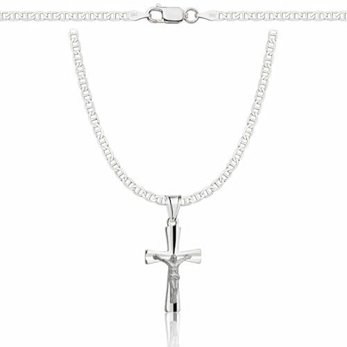 Morfetto Collier Croix pour Homme Argent 925 Kreuz Anhänger et Acier Inoxydable Chaîne Cubaine 5mm Large Imperméable Hypoallergénique Cadeau Noël Baptême avec Boîte Longueur 22-24 Inches