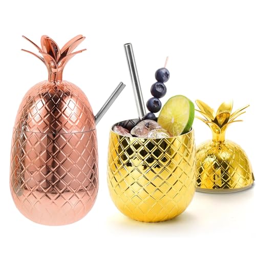 Healeved Lot de 2 verres à vin en acier inoxydable avec couvercle et paille en forme d'ananas pour piscine, fête tropicale, bar, 450 ml