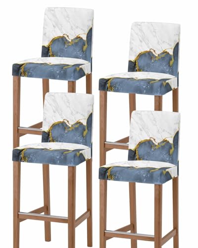 Scumlovy Ensemble de 4 Housses de tabourets de Bar en marbre Bleu et Or, Housses de chaises de Bar Extensibles et lavables avec Dossier, Motif marbre Abstrait Moderne craquelé, Housse Amovible pour c