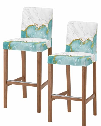 Scumlovy Ensemble de 2 Housses de tabourets de Bar en marbre Turquoise et doré, Housses Extensibles lavables avec Dossier, Texture marbre Abstrait Moderne craquelé, Housse Amovible pour Chaise de COM