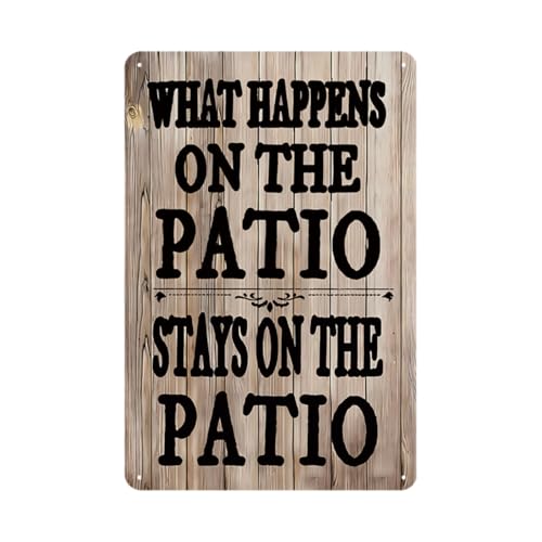 Plaque en métal amusante rétro « What Happens On The Patio » - Décoration murale pour intérieur et extérieur - Pour bar, piscine, cave, maison, bar, café, cuisine - 30,5 x 20,3 cm