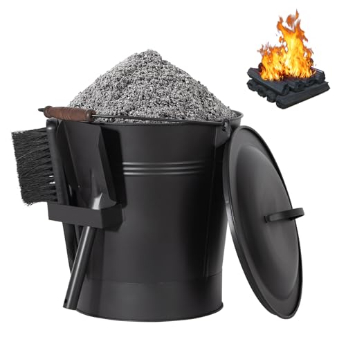 Todeco Seau à Cendres Métallique 19 L avec Couvercle, Pelle & Brosse, Résistant à la Chaleur, Poignée en Bois, pour Cheminée, Poêle à Bois, Foyer Extérieur, Barbecue ou Camping, Noir
