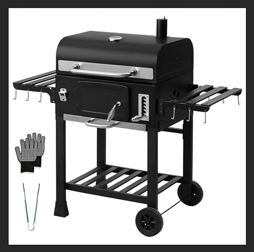 Barbecue Grill charbon de bois noir - Fumoir avec récupérateur de cendres. aérateurs. bac charbon ajustable et tablettes rabattables