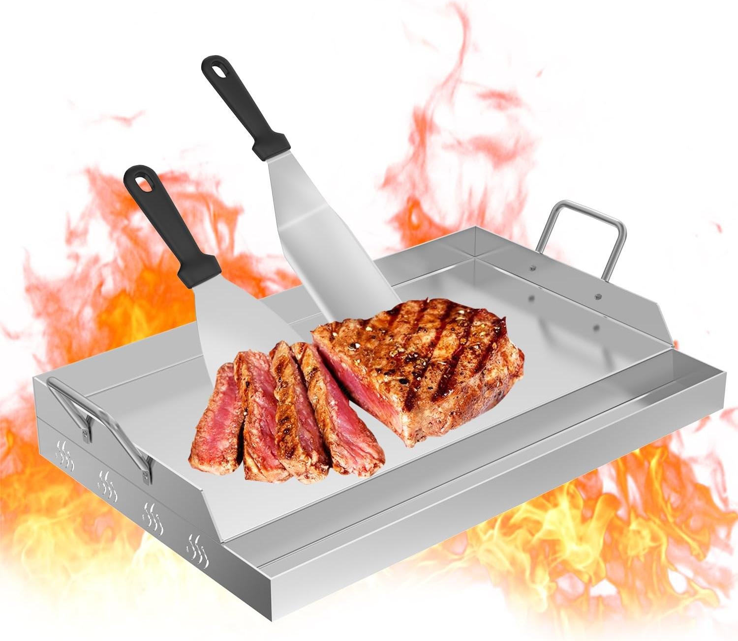 TWOLIIN Plaque de gril en acier inoxydable 51 x 32 x 7 cm BBQ Plancha Plaque de gril avec 2 spatules & poignées | Plaque de gril avec rigole pour l'huile | Plaque de feu Accessoires de gril pour barbecue au charbon de bois & au gaz