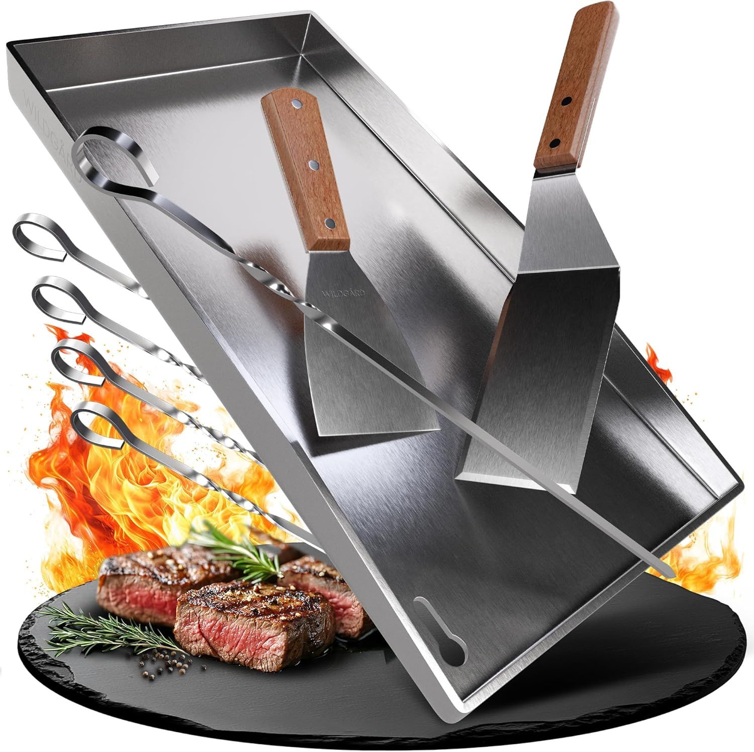 YARDIN Plaque de gril en acier inoxydable 51 x 32 x 7 cm BBQ Plancha Plaque de gril incl. 2 spatules & poignées | Plaque de gril avec gouttière pour huile | Plaque de feu Accessoires de gril pour barbecue au charbon de bois & au gaz