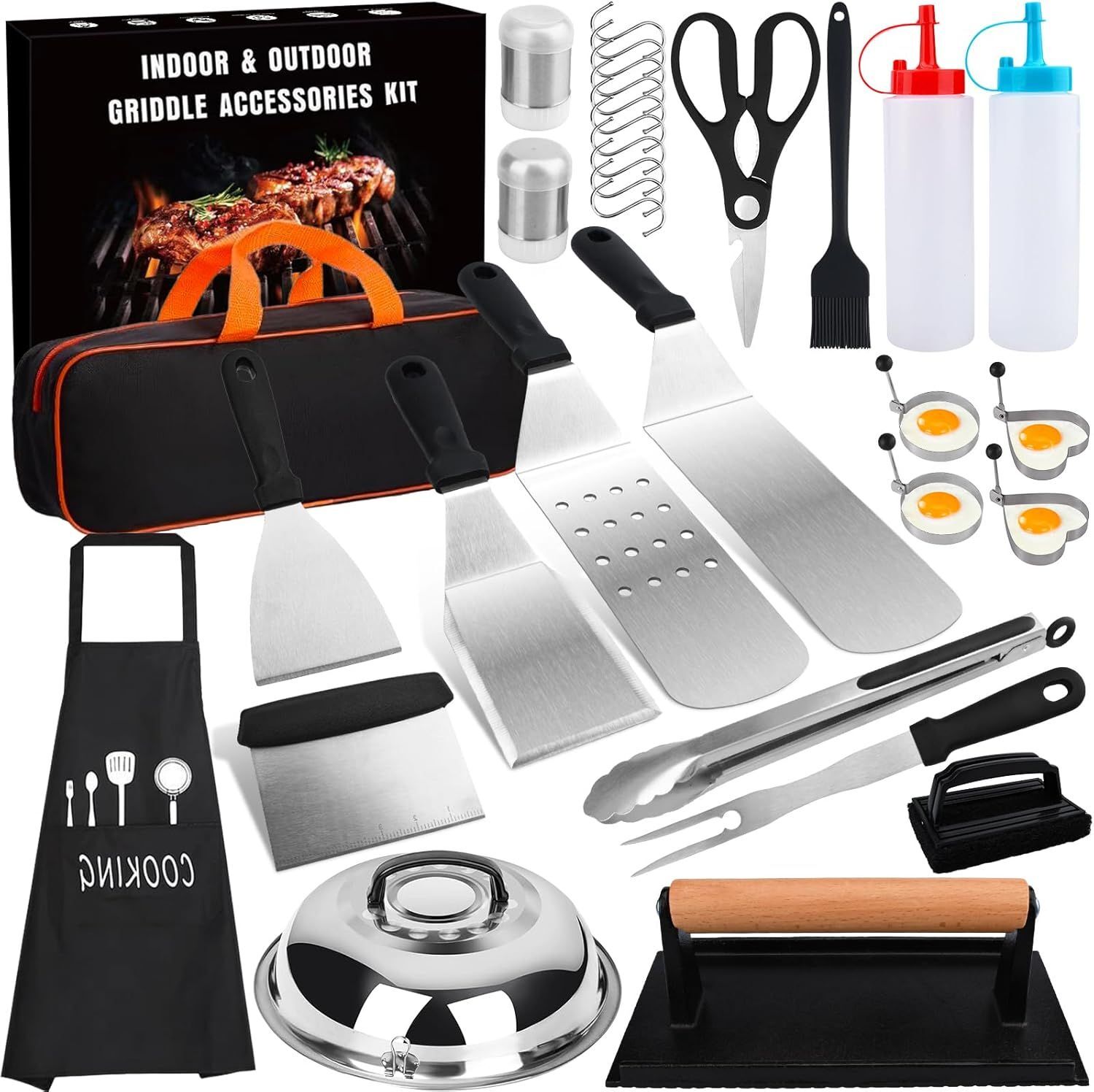grilljoy Set Spatule Plancha, 28 Professionnel Ustensiles Plancha INOX avec Smash Burger Press, Pince à Barbecue, Cloche Cuisson, Set Accessoires Plancha pour Barbecue à Gaz avec Plancha, Teppanyaki