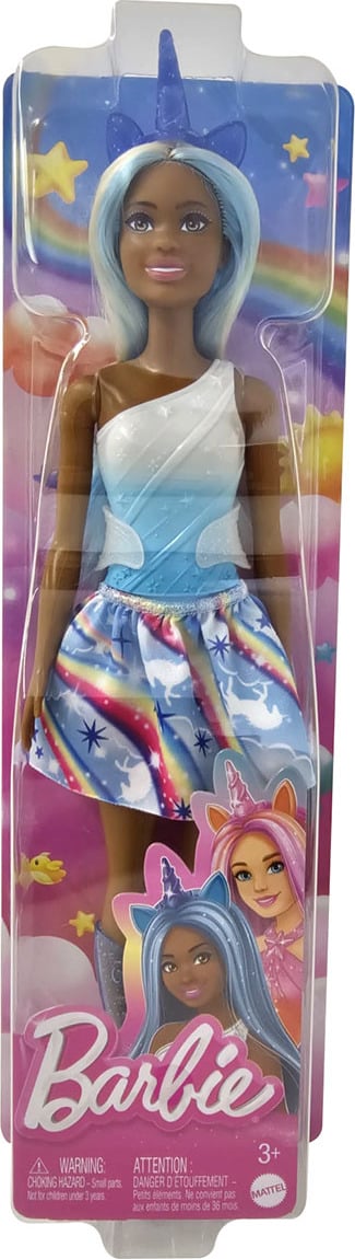 Mattel HRR14 Licorne Barbie brune avec robe arc-en-ciel Blanc Cheveux bleus Bottes bleues Couronne de licorne pour enfants