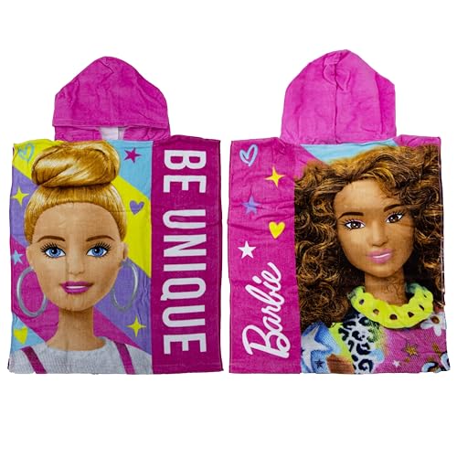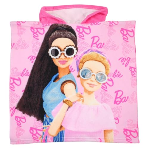 Character World Barbie Poncho Officiel à Capuche | Super Doux au Toucher, Design Frais | Peignoir de Bain pour Filles Parfait pour la Maison, Le Bain et la Plage, Rose, 115 x 50 cm