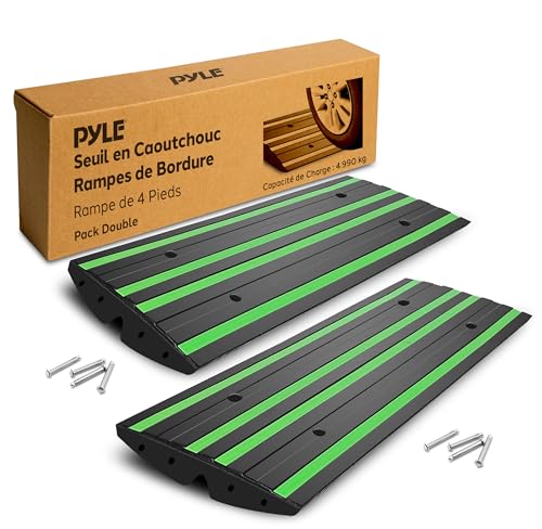 Pyle Rampe de Seuil en Caoutchouc–Rampe Bordure Antidérapante Usage Intensif- Bandes Réfléchissantes Vertes, Pour Garage, Allée, Trottoir, Voiture, Camion, Fauteuil Roulant, Chariot Élévateur-Lot de 2