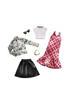 Barbie et ses amies ont fière allure dans ces tenues à la mode! L'ensemble comprend: 1 Chemise Oversize, 1 T-Shirt gris, 1 Jupe, 1
