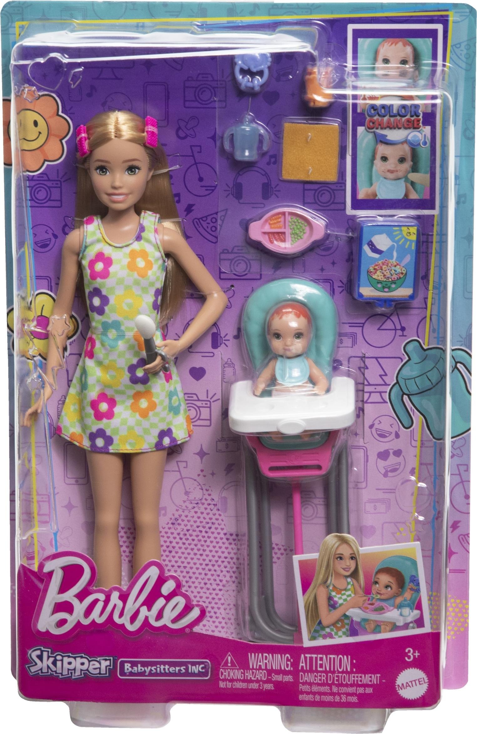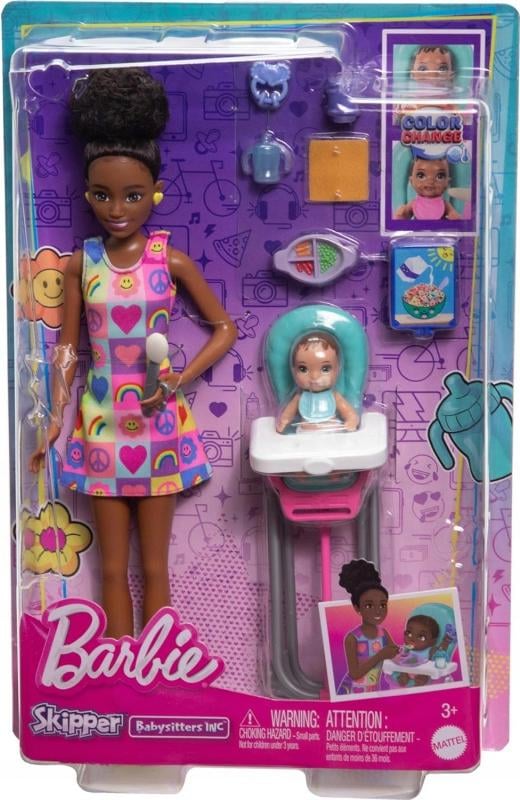 Barbie Coffret Skipper Baby-Sitter, avec poupée brune, poupée d’enfant brune, chaise haute et 8 accessoires dont de la nourriture, JJB44