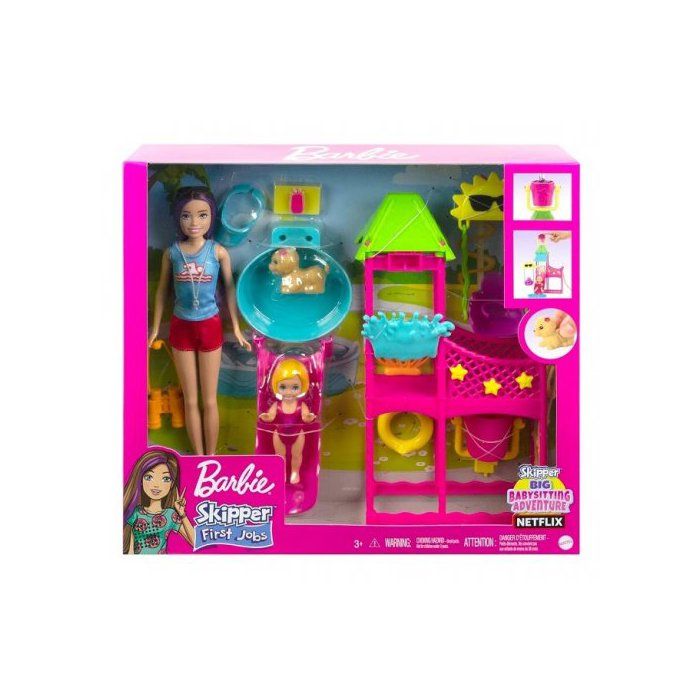 Barbie - Coffret Parc Aquatique avec piscine et toboggan - Poupees Skipper et Enfant - Set Metier Baby Sitter + carte animaux