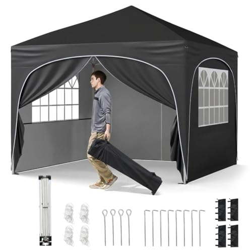 Sekey Tonnelle de Jardin 3x3m Imperméable Pop up, Barnum Pliant 3x3 avec Rideaux, Tonnelle de Jardin Exterieur, Anti UV Respirable Hauteur Réglable (Noir, avec des Parois Latérales)
