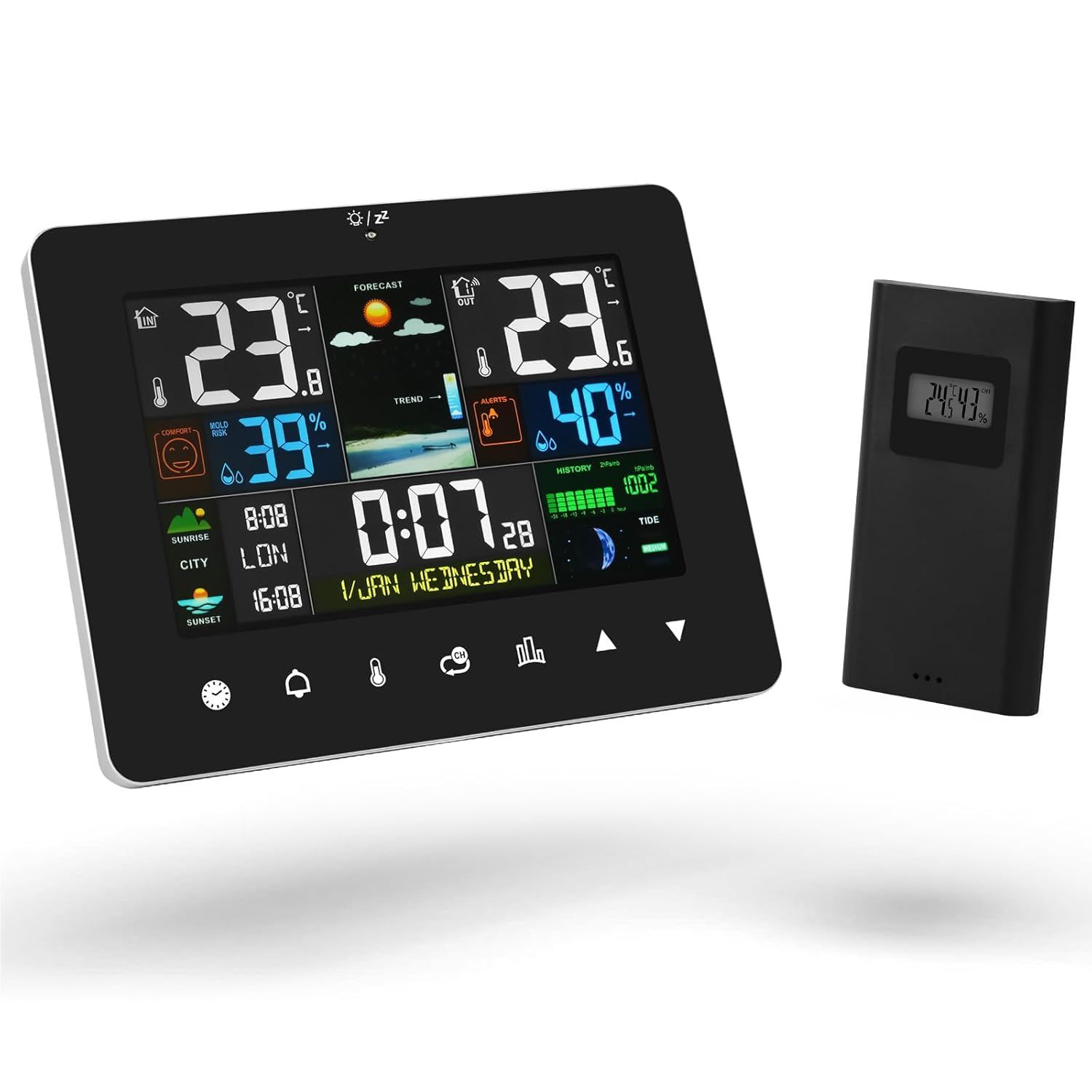 Station Météo Sans Fil Avec Écran LCD Couleur, Thermomètre Hygromètre Baromètre Intérieur Extérieur Heure DCF, Affichage 12/24 H, Prévisions, Température Humidité, Relevés Max/Min, Calendrier (Noir)