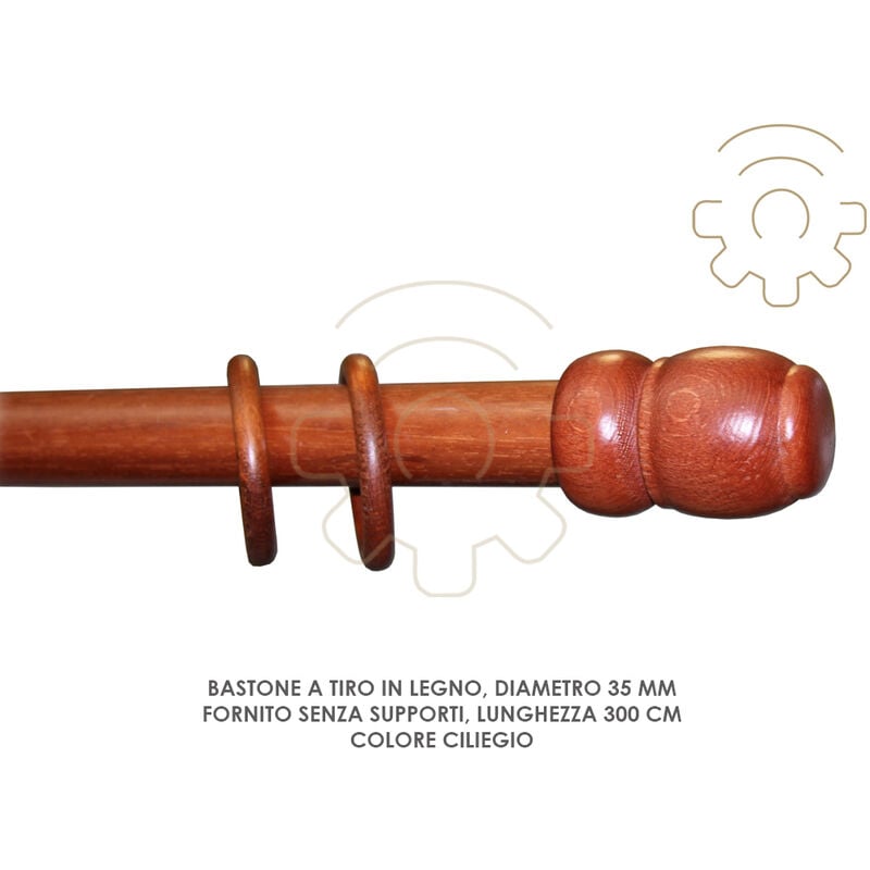 TENDAGGIMANIA Tringle Rideau Couleur CERISIER en Bois Resistant - Diamètre 35 mm - Longeur: 300 CM - Barre Rideau Mouvement à Cord - Avec Anneaux et tous les Accessoires