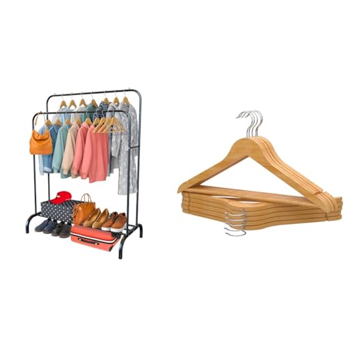 PORTENTUM Portant a vetement en acier Noir Renforcé avec Roues et Double Barre + 10 Cintres en Bois Massif Naturel avec Crochet Pivotant | Solution Premium de Rangement et de Style