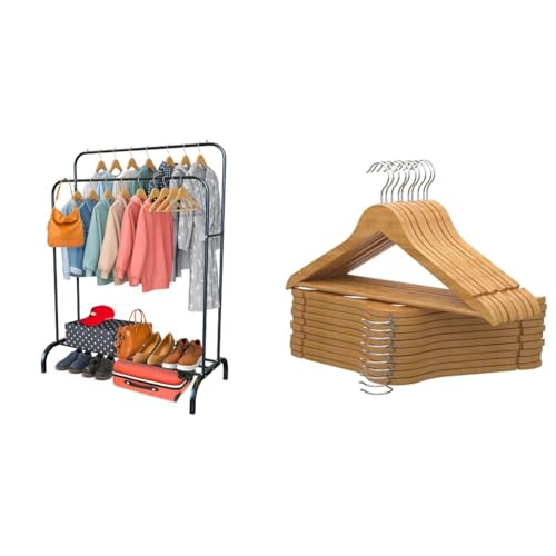 PORTENTUM Portant a vetement en acier Noir Renforcé avec Roues et Double Barre + 20 Cintres en Bois Massif Naturel avec Crochet Pivotant | Solution Premium de Rangement et de Style