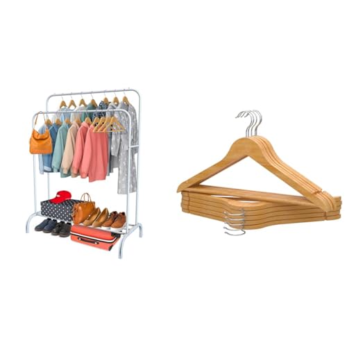PORTENTUM Portant a vetement en acier Blanc Renforcé avec Roues et Double Barre + 10 Cintres en Bois Massif Naturel avec Crochet Pivotant | Solution Premium de Rangement et de Style