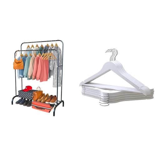 PORTENTUM Portant a vetement en acier Noir Renforcé avec Roues et Double Barre + 10 Cintres en Bois Massif Blanc avec Crochet Pivotant | Solution Premium de Rangement et de Style