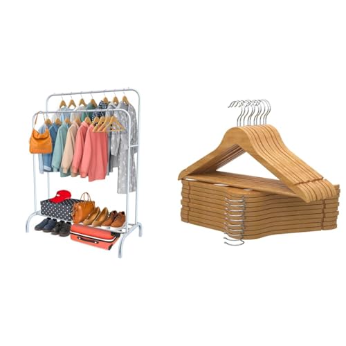 PORTENTUM Portant a vetement en acier Blanc Renforcé avec Roues et Double Barre + 20 Cintres en Bois Massif Naturel avec Crochet Pivotant | Solution Premium de Rangement et de Style