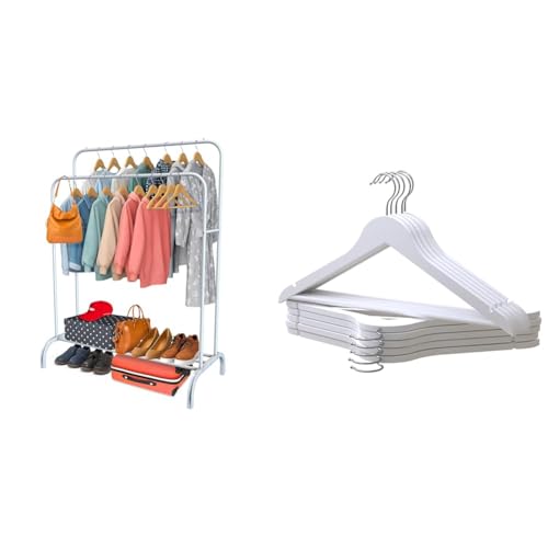 PORTENTUM Portant a vetement en acier Blanc Renforcé avec Roues et Double Barre + 10 Cintres en Bois Massif Blanc avec Crochet Pivotant | Solution Premium de Rangement et de Style
