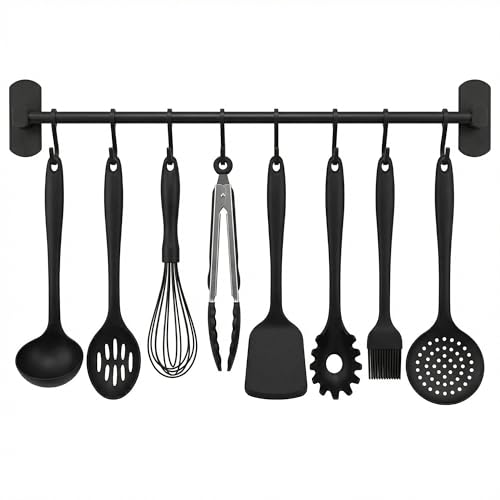 Porte ustensiles cuisine adhésif noir - Accroche ustensiles de cuisine 40 cm - Barre cuisine avec 8 crochets - Organiseurs et porte-ustensiles ou outils pour cuisine, salle de bains ou garage