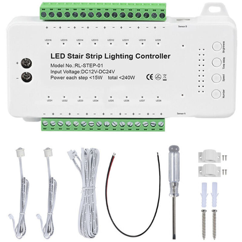 Contrôleur de barre lumineuse LED pour escalier (16 marches) avec capteur PIR intégré, éclairage d'ambiance décoratif et variateur d'intensité.