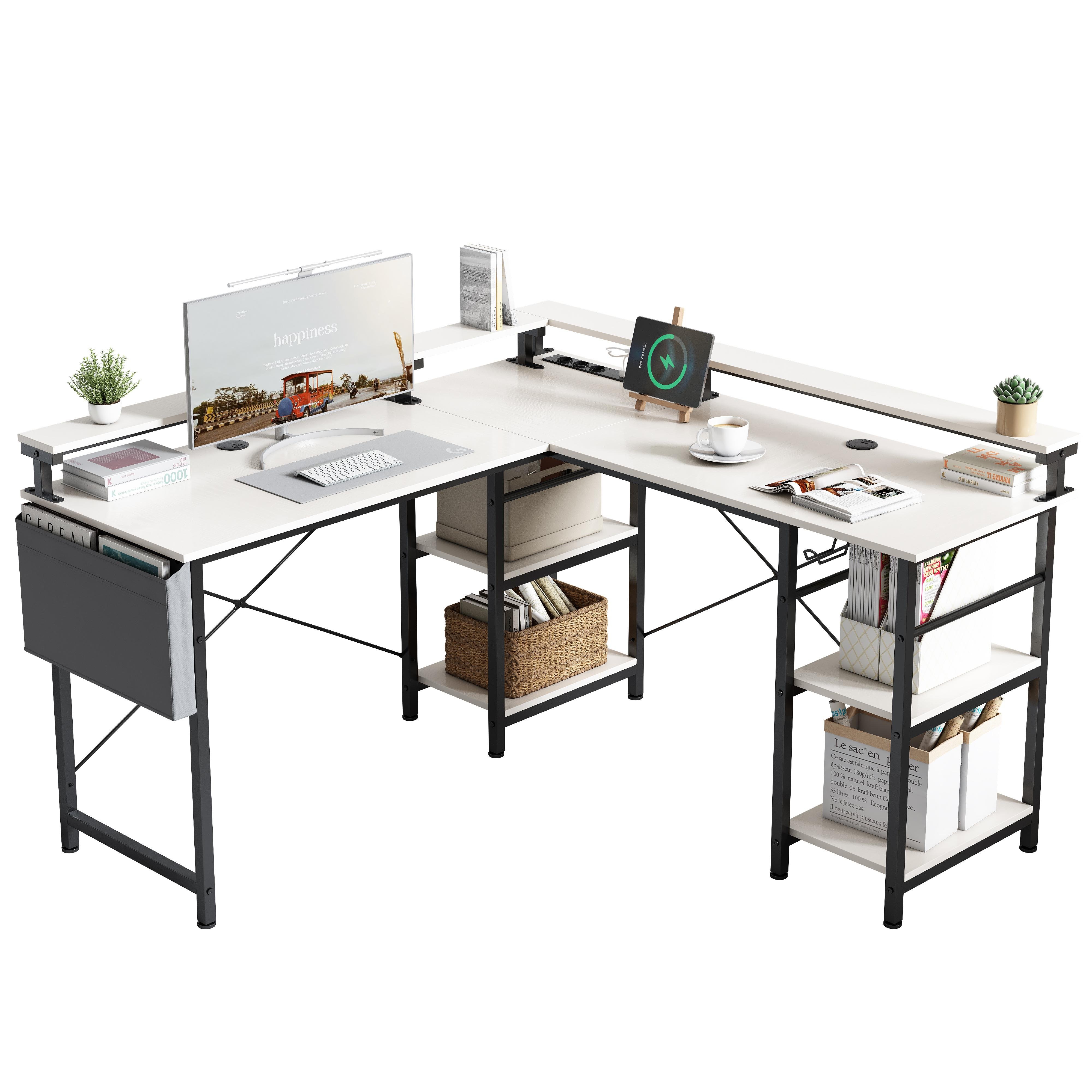 AIORBER Bureau en L, 140x140x85 cm, table d'ordinateur d'angle réversible avec prise électrique et barre de LED, table d'ordinateur de jeu, blanc