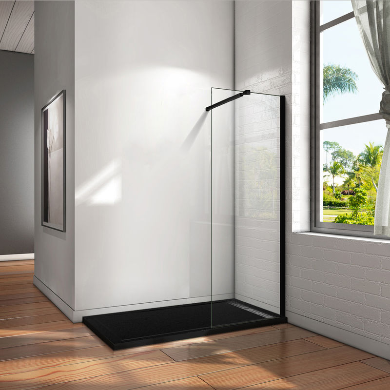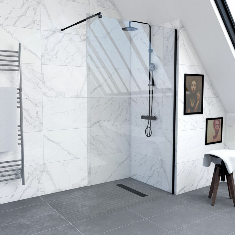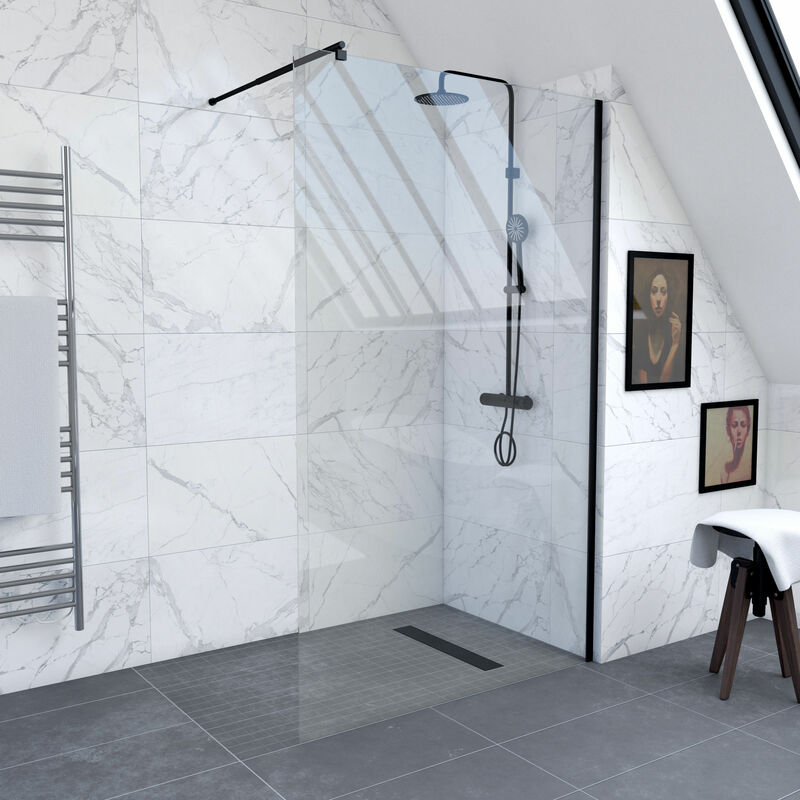 Aica Sanitaire - Paroi de douche 160x200cm en noire mat paroi à l'italienne en 8mm verre anticalcaire livré avec une barre de fixation extensible en