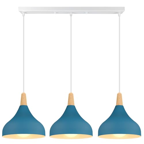 iDEGU 3 Lampes Suspension Luminaire Rétro E27 Lustre Suspension Moderne Style Goutte Chapeau Plafonnier Métal Bois Lampe de Plafond pour Salle à Manger Salon Cuisine, Ø 20CM (Bleu Oxford, Barre)