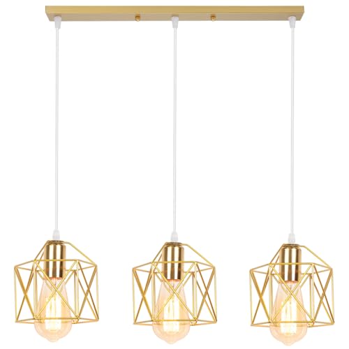 iDEGU 3 Lampes Suspension Luminaire Industriel Lustre Vintage en Métal Design Cage Hexagone Plafonnier Abat-Jour Luminaire E27 Éclairage de Plafond pour Chambre salle à manger Salon (Doré, Barre)