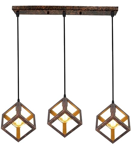 iDEGU 3 Lampes Suspension Luminaire Industriel Vintage en Métal Cage Lustre Plafonnier Abat-Jour Géométrique Design Luminaire E27 Lampe de Plafond avec Barre pour Chambre salle à manger Salon, Rouille