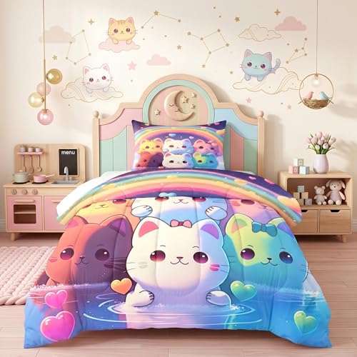 Jiospet Parure de lit Motif Chat Arc-en-Ciel pour lit Simple – Literie Chat Arc-en-Ciel pour Chambre de Fille, Parure de lit Arc-en-Ciel Mignonne pour Enfants, 1 Couette + 1 taie d'oreiller