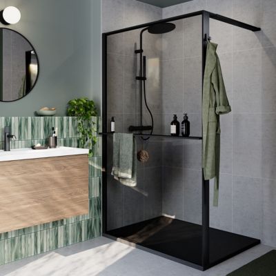 Paroi de douche à l'italienne l.120 x H.195 cm, verre transparent, profilés noir, GoodHome Evanna + barre fixe