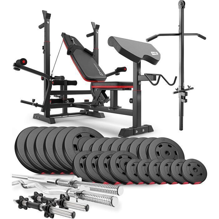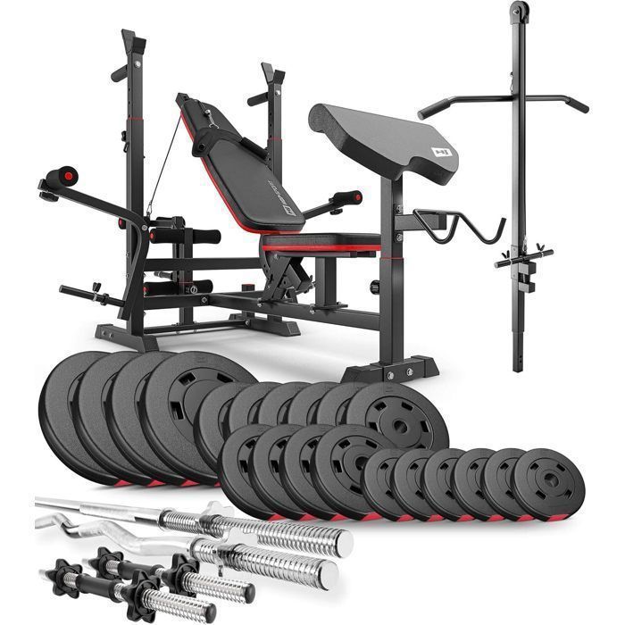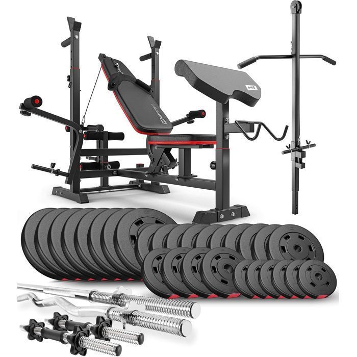Ensemble dhaltères 173 kg Hop-Sport Banc de Musculation et Poulie haute HS-1075 Set Disques de Poids 31 mm et Barres dhaltères