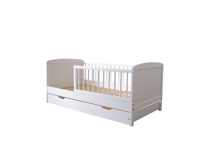 Lit enfant 70x140 cm - Avec sommier et tiroir - Lit enfant évolutif - Barrière de lit amovible - Bois de pin - Blanc