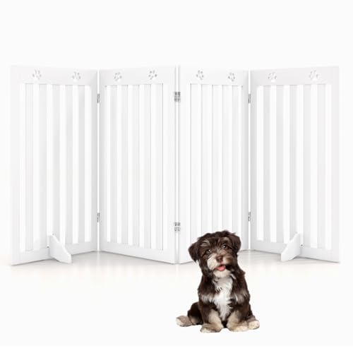 SOARS Barrière de Sécurité Chien 204 x 60 cm, Barrière Chien Pliable en Bois à 4 Panneaux avec Pieds Stables, pour Escalier, Entrées, Porte et Salon (Blanc)